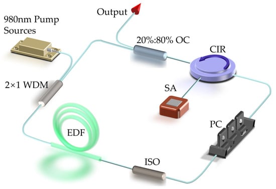 In the experiment described in this paper, the prepared PSM-SA was integrated into a ring cavity system [41], providing insights into its behavior within the laser setup as depicted in Figure 4. In the experimental test system, the 976 nm pump laser is coupled into the ring cavity through a WDM. The 4 m long EDF gain medium, a key component, played a pivotal role. It enabled the excitation of erbium-doped ions to a higher energy state upon interaction with the pump source. Subsequently, these excited ions rapidly relaxed to a metastable state, initiating the emission of C-band laser radiation through a well-established process [42]. To ensure the stability and efficiency of our laser system, we incorporated a 1550 nm ISO for unidirectional transmission. This essential component ensured that the optical signal traveled in a single direction within the setup, preventing damage to the pump source. Once the continuous wave light from the gain medium passes through the CIR, it irradiates the PSM-SA. This interaction led to the modulation of light into a pulsed form, a pivotal step in our laser operation. Subsequently, these modulated pulsed light signals were recoupled back into the ring cavity. To further manipulate the characteristics of the output pulses, we utilized a polarization controller (PC) to control the polarization state of the pulsed laser. This precise control allowed us to tailor the output pulses to meet our specific requirements. After passing through the OC, an ingeniously designed optical component, 20% of the optical signal was extracted for monitoring and meticulous measurement purposes. This extracted signal allowed us to continuously monitor the laser’s performance characteristics, including output power, pulse duration, and spectral properties. The remaining 80% of the optical signal was cleverly recoupled back into the ring cavity using the WDM, thus ensuring that the laser reaches the gain threshold. The output characteristics of the fiber laser are monitored and analyzed using a photodetector, a digital oscilloscope (Keysight DSOS054A, Keysight Technologies, Santa Rosa, CA, USA), and a spectral analyzer (Anritsu MS9740A, Anritsu Corporation, Atsugi, Japan).