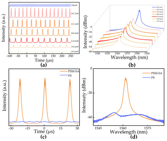 Within the confines of our experimental setup, we made a remarkable observation regarding the PSM-SA’s behavior. It has been observed that the PSM-SA in this setup exhibits the ability to self-initiate Q-switched output characteristics when the output power is increased. In Figure 5a, we present the compelling time–domain pulse sequence captured from the laser system’s output via the OC. This pulse sequence illustrates the dynamic evolution of the Q-switched pulses as the pumping power gradually escalates. On the horizontal axis we traverse through time, while the vertical axis portrays the pulse intensity. As the pumping power progressively rises and reaches the threshold of 80 mW, the laser system seamlessly transitions into a Q-switched regime. In this regime, the laser generates distinct short, high-energy pulses with precisely defined time intervals between them. The phenomenon is indicative of the laser’s newfound capability to produce pulsed output with remarkable temporal precision. When the pumping power approaches around 340 mW, the fiber laser system operates at its most stable state, consistently producing Q-switched pulses. The corresponding spectrum is shown in Figure 5b.