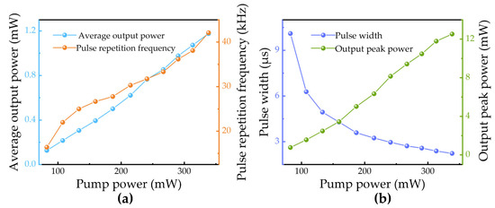 Figure 6 unveils a comprehensive depiction of the output characteristics, providing a nuanced insight into the dynamic evolution of the Q-switched pulse waveform as previously illustrated in Figure 5a. First and foremost, the average output power of the fiber laser demonstrates an intriguingly linear increase in correspondence with the ascending pump power. At its zenith, the system achieves an impressive output power of 1.17 mW, mirroring the ascending waveform height illustrated in Figure 6a. This linear correlation is a testament to the system’s capacity to efficiently harness and convert pump power into useful laser output. As the pump power intensifies, the duration of pulse energy accumulation within the PSM notably diminishes. This reduction in pulse duration translates into an elevation in the repetition frequency, denoted as f. When the pump power reaches its maximum value, the frequency increases to 42.1 kHz, as depicted in Figure 6b. This surge in repetition frequency coincides with an increase in peak power, reaching a maximum of about 12.5 mW. The continuous decrease in pulse width is a notable observation, primarily attributed to the enhanced bleaching effect of the SA [43,44]. However, it is important to acknowledge that there are inherent limitations to further reducing the pulse width. This limitation arises from the saturation effect inherent to the gain fiber within the system and the constraints imposed by the damage threshold and conversion efficiency of the PSM-SA itself. The minimum value of the pulse width is approximately 22.3 μs. In terms of pulse energy, it exhibits a pronounced upward trend in tandem with the pump power’s ascent, gradually stabilizing as it approaches its maximum value of approximately 28 nJ. The relationship between these parameters illustrates the dynamic interaction of output power, repetition rate, peak power, pulse width and pulse energy in the laser system with the change in pump power, reflecting the characteristics and limitations of the process of PSM-SA, providing a comprehensive understanding of its operational dynamics. Their relationship is: