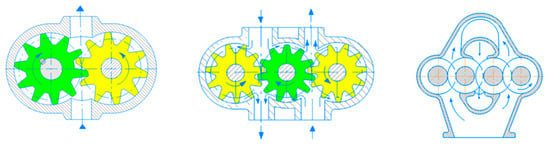 Designs of external gear pumps with different numbers of driven gears on the same axis [10,11,12,13].