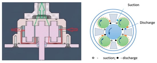 Designs of external gear pumps with driven gears around the drive axis [16,17].