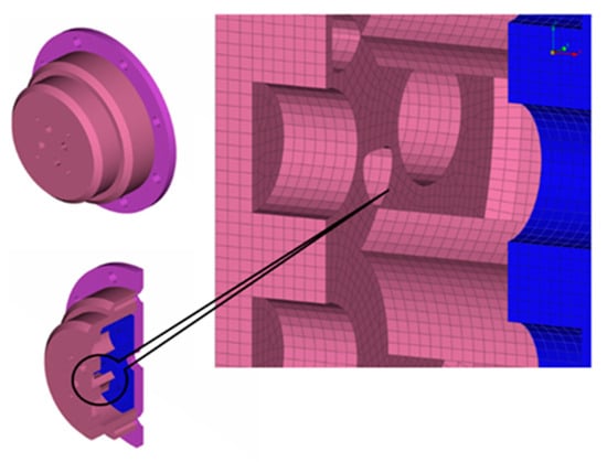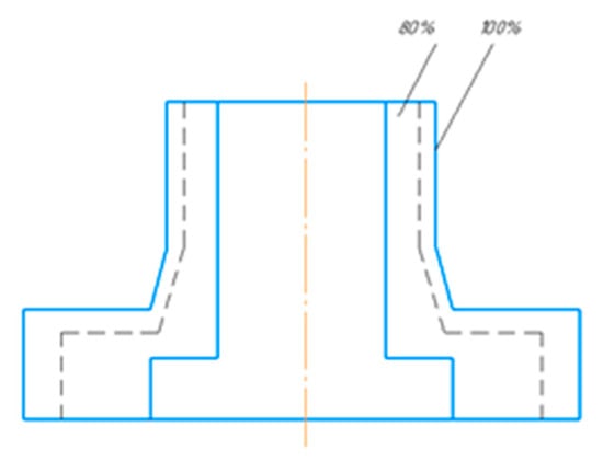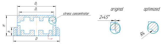 As the modeling has shown, the groove on the bottom of the casing, formed by a chamfer on the outside, is a stress concentrator. As this stress concentrator cannot be removed or moved, it is necessary to increase the cross-section of the groove by rounding it (Figure 23). Similar groove modifications have also brought about benefits in stress distribution in other studies [54,55].