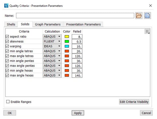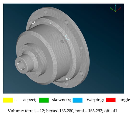 When creating a computational model for analysis, a standard procedure is performed to apply a finite element mesh. In the meshing process, three-dimensional second-order HEXA FEMs (hexa elements) were used. HEXA FEM (hexa elements) is the best element for modeling; in turn, when modeling, the use of TETRA FEM is avoided, since this type of element concentrates stress in the structure of the model. To accurately represent the distribution of internal stresses in samples under the influence of external forces, it is necessary to pay due attention to the distribution of the finite element mesh. The validity of the results depends on the quality of the network. To achieve optimal mesh quality, quality criteria for a finite element mesh were used (Figure 7). The number of elements that do not pass the quality criteria is less than 1% of the total number of elements (Figure 8), which is the optimal value. The total number of elements of the model is 163,292, of which 12 are tetras; this is less than 1% and is acceptable for this model (Figure 8).