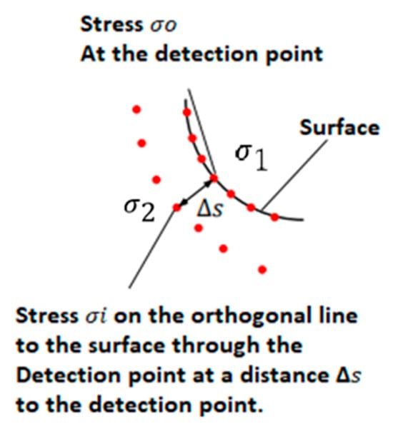 To analyze the fatigue strength and the nature of the stress propagation in the gear pump, the calculation method presented in the FKM manual [42] was used. According to this technique, the readings of the characteristics of the internal stress are taken from two points, taking into account the distance between them and calculating the stress gradient (Figure 10).