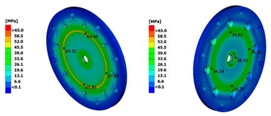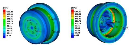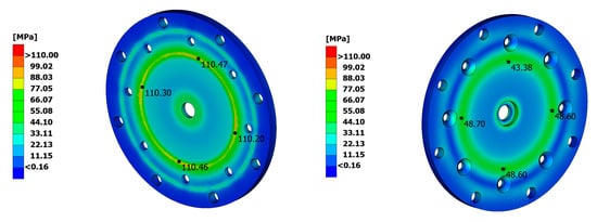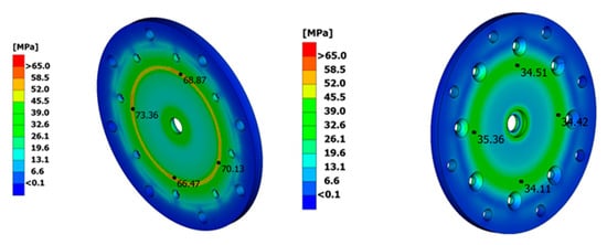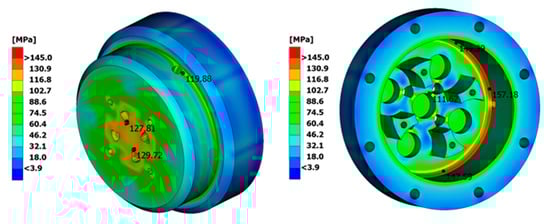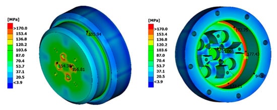 As a result of the simulation, the stress distributions in the gear pump casing were obtained (Figure 11 and Figure 12). From the figures, it is clear that the most loaded part of the gear pump casing is the bottom of the casing along the entire diameter at the transition to the vertical surface of the wall. The maximum stresses in the aluminum casing are 172 ÷ 177 MPa (Figure 11). The maximum stresses in the cast iron casing are 147 ÷ 157 MPa (Figure 12). The maximum stresses in the polycarbonate casing are 187 ÷ 200 MPa (Figure 13).