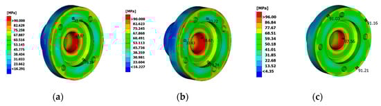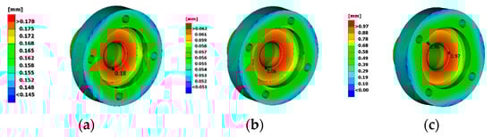 Deformations in the optimized design of the front cover of a gear pump: (a) aluminum front cover; (b) cast iron front cover; (c) polycarbonate front cover.
