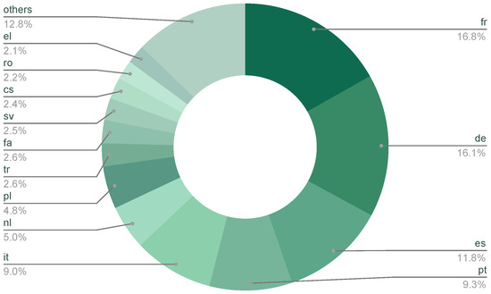 esCorpius-m supports 34 languages, with Spanish being the most dominant, covering nearly 20% of the entire corpus (see Figure 1).