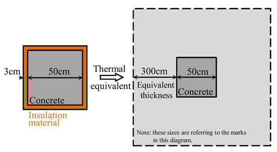 In this experiment, a concrete block was designed for temperature measurements, and its lateral surface had a layer of thermal insulation material. The size of the concrete specimen was 50 cm × 50 cm × 40 cm (length × width × thickness); a thickness of 40 cm is the considered maximum influential depth of gradient temperatures in the Chinese specifications JTG D60-2015 [25]. The thermal insulation layer was made of polystyrene with a thickness of 3 cm and a thermal conductivity of 0.03 W/°C/m. If the thermal conductivity of concrete is taken as 3 W/°C/m [26,27], the thermal insulation material can be a thermal equivalent to concrete material with a thickness of 3 m. Therefore, the concrete specimen in this experiment was equivalent to the core part of a thin-walled concrete slab, with just 2% consumption of concrete, as shown in Figure 1. The material components and corresponding proportions of the concrete specimen are detailed in Table 1.