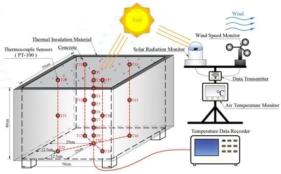 The whole experimental process was conducted as shown in Figure 2. The concrete specimen with a lateral insulation layer was placed in a natural environment, while its bottom and top surface were both exposed to the air temperature. Furthermore, the top surface was irradiated with extra solar radiation.