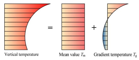In various design specifications of different countries for bridges or road pavements, such as Chinese JTG D60-2015 [25] and American AATHSO LRDF [28], the vertical temperature is often considered as the main thermal load. According to these specifications, the thin-walled concrete temperature is composed of the mean temperature (Tm) and gradient temperature (Tg), as shown in Figure 4. The mean temperature is the reason for uniform shrinkage or expansion of concrete structures, while the gradient temperature causes uneven bending or twisting. For the experiment in this study, Tm and Tg were calculated using Equation (1).