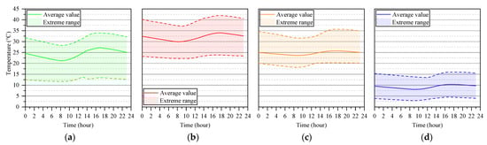 According to our statistics, the average variation and extreme range within 24 h of the Tm by season are shown in Figure 5. From the perspective of the average value, the Tm in summer was the highest and lowest in winter, and the Tm values in spring and autumn were similar in magnitude. In terms of the width of the range, the Tm in spring had the widest fluctuation range, which was caused by the combined action of cold land and increasing solar radiation. In addition, there was a general rule that fluctuations in Tm within a day showed a sine wave pattern, with the valley usually occurring at 8:00 and the peak occurring at 16:00. The valley values of the Tm in spring, summer, autumn, and winter were, respectively, 11.5 °C, 22.1 °C, 18.2 °C, and 2.8 °C, while the corresponding peak values were 33.8 °C, 42.2 °C, 36.3 °C, and 16.7 °C, respectively.