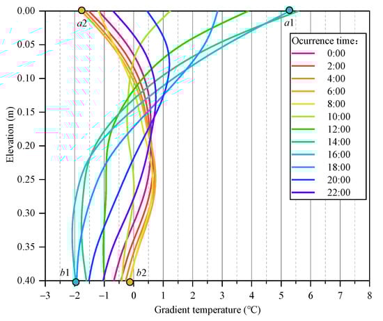 - is the gradient temperature pattern when the temperature difference between the top and bottom elevations is the maximum negative value within a day. For example, the gradient temperature pattern at 6:00 in Figure 6 corresponds to the smallest value of −1.63 °C within a day (the difference between point a2 and point b2).