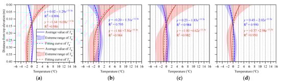 According to the statistics of the and by season, the average variation and extreme range within 24 h by season are shown in Figure 7. Whether from the perspective of the values within or the width of the distribution range, the gradient temperature in summer was the strongest and weakest in winter. Moreover, it was found that, for all seasons, both the and could be expressed by an exponential function, as shown in Equation (2), where m is the corresponding gradient temperature value at the bottom elevation (Tgb), while n is the difference between the gradient temperature at the top (Tgt) and Tgb, a is a parameter that needs to be determined, and z is the distance (m) from the top elevation.