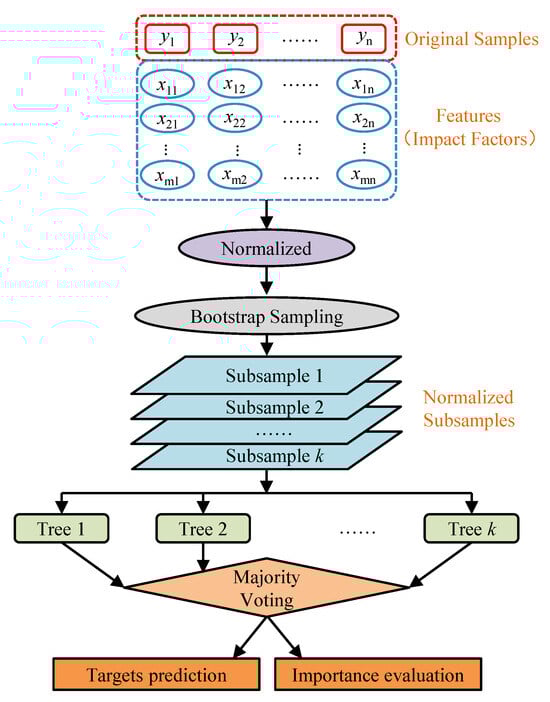 In this study, random forest regression was performed using MATLAB, and the whole execution process is shown in Figure 8. Firstly, each target in the sample corresponds to several features. The target can be regarded as the dependent variable, and the features as the potential influencing factors. Secondly, all the features were normalized to avoid errors caused by different statistical units. Thirdly, by using bootstrap sampling, the normalized original samples were extracted as multiple random subsamples to establish a forest composed of decision trees. Finally, the prediction of targets and the importance of features were obtained by the majority vote of all the decision trees.