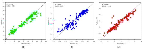 Comparison of the measured data with the results predicted by random forest regression: (a) Tm; (b) Tgb; (c) Tgt.