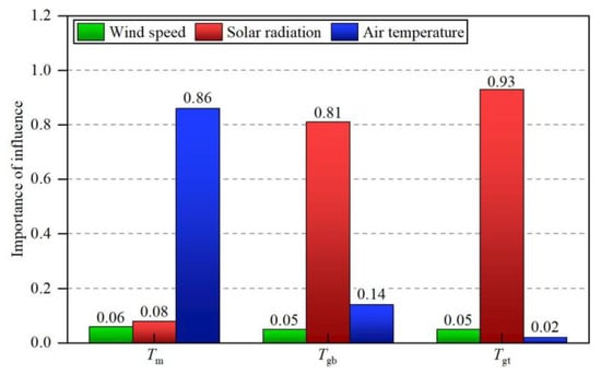The normalized influence of the environmental factors on Tm, Tgb, and Tgt are illustrated in Figure 10. The influence value of a feature represents its contribution ratio when voting for the prediction, and a larger importance value indicates that the target is more sensitive to the feature. The influence of wind speed was negligible for all the concrete temperature characteristics. Moreover, air temperature and solar radiation produced different effects on the concrete temperature field.