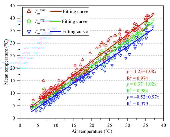 As per the sensitivity analysis results, air temperature was the main factor that influenced Tm. Thus, the correlation between the mean concrete temperature and the average air temperature should be clarified. The correlations between the average value, as well as the extreme values of Tm, and the average air temperature were drawn, as shown in Figure 11, and the superscripts min, avg, and max represent the minimum, average, and maximum value within a day, respectively. , , and were all linearly and positively correlated with the average air temperature. The correlation ratios (°C/°C) were, respectively, 0.97, 1.02, and 1.08, indicating that the higher the average air temperature within a day, the wider the fluctuation range of Tm.