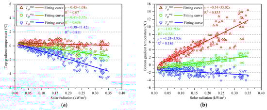 For the bottom surface, and were both negatively and linearly correlated with the average solar radiation, and the correlation ratios (°C/kW) were −11.4 and −5.37, respectively. Negative correlation ratios showed that strong sunshine increased the temperature of the upper part of the concrete more effectively, so the temperature of the lower part of the concrete increased more slowly compared to the mean temperature. Moreover, there was no correlation between and average solar radiation, so an average value of 0.3 °C was more representative.