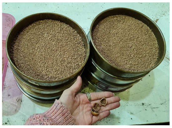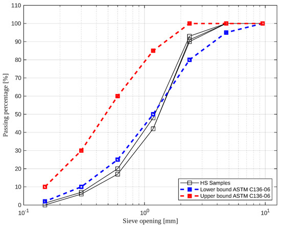 Once in the laboratory, the shells were crushed using a hand-made device consisting of an aluminum pot and an angle grinder with steel blades. Figure 2 shows the crushed hazelnut shell powder in standard brass sieves. The process to obtain different grain sizes was performed at 1100 rpm. After grinding, the material was dried in a temperature-controlled oven for 72 h at 60 °C and then sieve-sized to evaluate its similarity with the fine aggregate by comparing it with the specifications in the ASTM C33/C33M-18 standard [34]. In Figure 3 a comparison between the sieve tests performed on three samples of crushed hazelnut shell and the limits for a normal or medium-sized sand are presented. The aim was to show in a illustrative manner where the sieve test results for the HS fell in comparison with the standardized band defined for fine aggregates according to ASTM C136-06 [33]. The graph indicates that greater particle sizes were obtained from the grinding process, resulting in lower passing percentages.