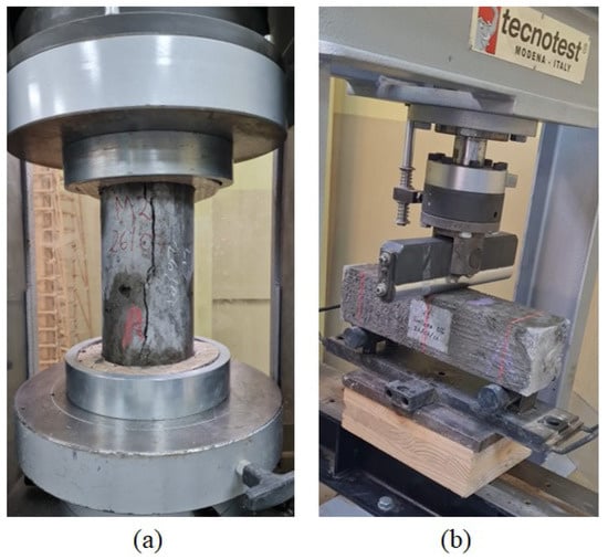 Fresh concrete was placed into the prismatic molds and compacted to ensure proper consolidation and eliminate air voids. After molding, the specimens were covered with a plastic sheet to maintain a suitable curing environment and prevent moisture loss. A Tecnotest hydraulic press (model KE 300/A, serial number 2907) manufactured in Modena, Italy, with a maximum compression capacity of 3000 kN, 100 kN in flexion, and equipped with a loading system capable of applying a step load, was employed for conducting the bending strength tests according to ASTM C293 [39]. During the testing process, a step load was applied to the prismatic specimens at a constant rate of 0.02 MPa/s to ensure a gradual and controlled application of tensile forces. Each prismatic specimen was positioned horizontally on the supports of the hydraulic press, ensuring that the load was evenly distributed along the length of the specimen. This setup prevented any localized stress concentrations that could affect the results.