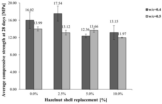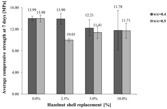 It can be observed that the compressive strength was higher for lower w/c ratios (w/c ). This trend suggests that the density is directly proportional for conventional concretes, and similar conclusions can be found for other organic materials used as replacements for fine aggregates [55]. However, this relationship did not hold for concretes with higher percentages of hazelnut shell, which is lighter and more porous than regular aggregates. Consequently, the density of the concrete with a higher hazelnut shell content was lower, resulting in an increased air percentage and a reduction in concrete strength. For instance, in a study conducted by Qudoos et al. [56], polypropylene fibers and waste slag aggregates (WSAs) were employed as partial substitutes for cement in concrete. The results indicated a reduction in compressive strength and an enhancement in flexural strength upon the inclusion of polypropylene fibers. Conversely, the incorporation of WSAs led to a densification of the microstructure, attributed to its pozzolanic activity. Arif et al. [57] obtained similar patterns when incorporating sugarcane bagasse ash as a filler in concrete. It was observed that the density of the hardened concrete increased when the replacement level reached 20%, despite a decrease in compressive strength at that particular replacement level. This increase in density was attributed to the filler effect of the sugarcane bagasse ash at higher replacement percentages.