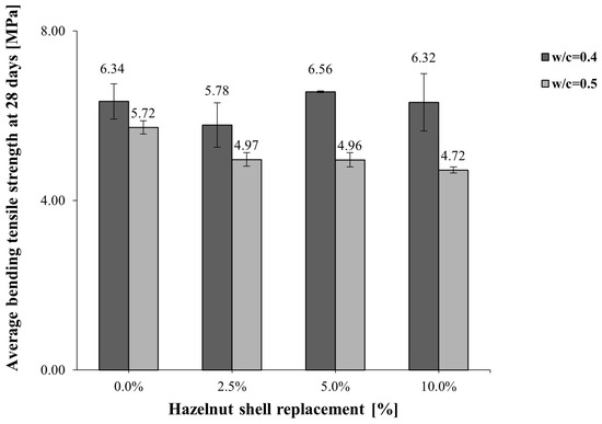 The bending strength results for both water/cement ratios are shown in Figure 7. For the 0.4 w/c ratio, the bending strength varied by −8.8%, +3.5%, and 0.3% for HS replacement percentages of 2.5%, 5%, and 10%, respectively, compared to the standard specimens. These results indicate that the strength tended to remain stable or even slightly increase as the HS replacement percentage increased.