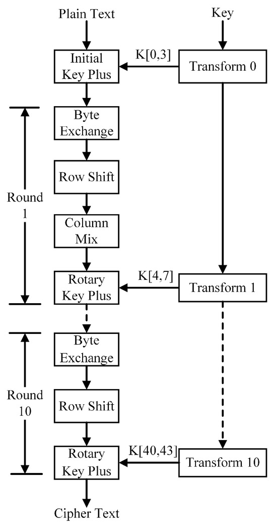 The AES algorithm operates on the principle of a block cipher, wherein plaintext data are divided into fixed-length blocks, and encryption and decryption are achieved through iterative operations and key expansion. The AES encryption process is depicted in Figure 1. This process ensures data protection through iterative rounds of encryption, with each round comprising specific steps such as byte exchange, row shift, column mix, and round key plus. A detailed breakdown of Figure 1 is as follows: