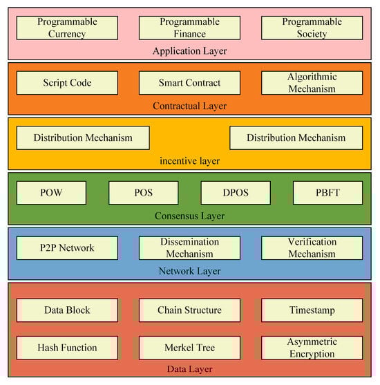 In 2008, Satoshi Nakamoto introduced a groundbreaking electronic transaction system that operates independently of a trusted third party, marking the inception of blockchain technology [14]. A blockchain is a decentralized global ledger database, fortified by cryptographic methods, ensuring its attributes of decentralization, immutability, data integrity, and transparency. This avant-garde technology amalgamates peer-to-peer (P2P) networking [15], asymmetric encryption [16], and consensus mechanisms [17]. Utilizing an encrypted blockchain architecture, it stores data and verifies their authenticity and precision. Its applications span various sectors, including financial transactions, healthcare, digital currencies, and more. Figure 2 delineates the hierarchical structure of a blockchain.