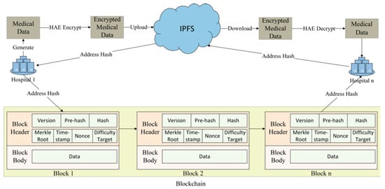 Considering its practical application within blockchain medical contexts, as illustrated in Figure 5, medical data are encrypted and housed within the InterPlanetary File System (IPFS). The address hash returned by IPFS is then disseminated and stored across blockchain nodes. Given the minimal data volume within this hash, there is no significant resource consumption. As a result, the hybrid cryptographic algorithm HAE holds promising potential for deployment in blockchain medical scenarios.