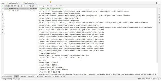 The algorithm’s outcomes are illustrated in Figure 6. This figure sequentially presents the ECC public key, ECC private key, the AES key used for encryption, the AES key post-encryption with the public key, the actual content encrypted using the AES key, the AES key after decryption, and the actual content post-decryption. For the results in Figure 6, we employed Base64 encoding. Base64 is a widely used encoding method that transforms binary data into a text format composed of 64 printable ASCII characters. This encoding is essential for transmitting binary data in systems or communication protocols that do not support binary transmission. Since ASCII characters can be securely transmitted in text-based protocols, Base64 encoding ensures the data’s integrity and reliability by converting binary data into a text format for transmission.