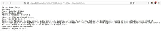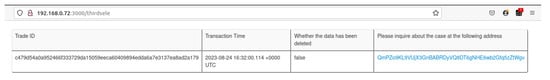 Figure 7 illustrates the procedure for sharing the address hash within the blockchain-based healthcare system. The figure delineates various elements, including the transaction ID, transaction time, data deletion status, and the IPFS address hash. Hospital 1 uploads the address hash to the blockchain. To access data related to a specific visit, Hospital n must retrieve the IPFS address hash, initially uploaded by Hospital 1, via blockchain sharing. Subsequently, Hospital n extracts the encrypted data from IPFS and decrypts them using the hybrid cryptographic algorithm HAE to obtain the original medical data, as depicted in Figure 8.