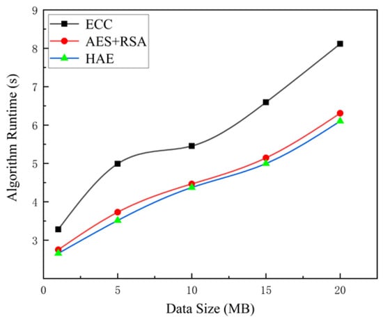 Given the limitations of algorithms such as AES, DES, and RSA, including challenges in key management and lower security strength, this paper selects ECC, the AES+RSA hybrid cryptographic algorithm [28], and the AES+ECC hybrid cryptographic algorithm HAE proposed herein for comparative analysis, as depicted in Figure 9.