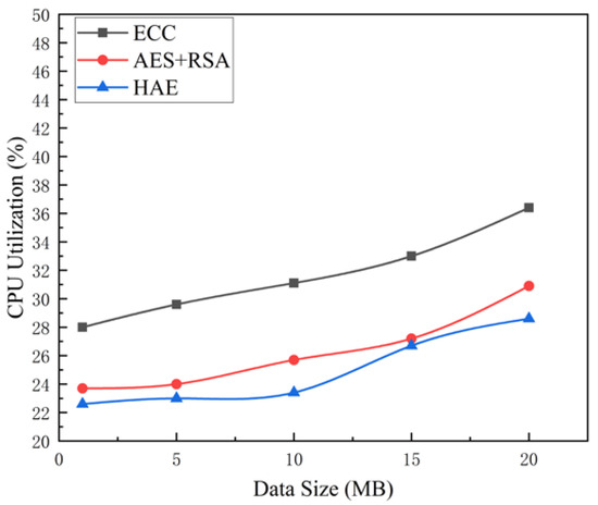 From an algorithmic perspective, as depicted in Figure 10, the CPU utilization for the hybrid cryptographic algorithm HAE exhibits a slight increase with the growth in data size. Nevertheless, this uptick remains modest, hovering between 20% and 30%. Furthermore, the HAE algorithm demonstrates a reduced CPU utilization rate for equivalent data sizes, compared to both the ECC and the combined AES+RSA algorithms. This suggests that HAE is more efficient in terms of resource consumption.