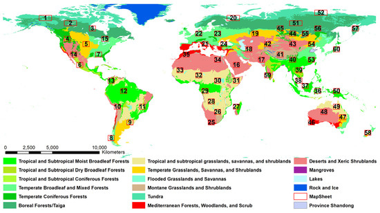 The sample map sheets of GlobeLand30 with a background of the terrestrial eco-region map (sheets number range from 1 to 60) and the location of the Shandong Province of China.