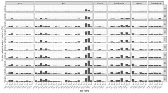Figure 7 displays the average proportions of underdetermined pixels and mixed pixels for the ten mixed scales across all sixty land cover maps. The graph shows that the number of mixed pixels increases with the mixed scales, and a larger portion of these mixed pixels gradually encounters the underdetermined problem. Generally, the proportions of underdetermined pixels remain at a low level, accounting for 0.1% to 2% of mixed pixels. However, when considering the enormous number of mixed pixels from various remote sensing systems that image the global land surface day and night, this issue becomes significant.