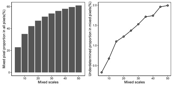 The proportion of underdetermined mixed pixels among land cover maps, where mixed scales range from 5 to 50.