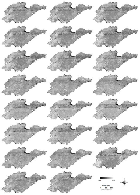 The generated fine-resolution NDVI images of the Shandong Province (China) of 2010 in row–major order via the elastic window.