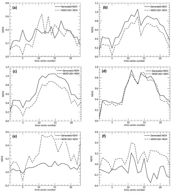 The generated NDVI curves of typical land cover class in the Shandong Province (China), where (a) denotes built-up, (b) denotes crop, (c) denotes forest, (d) denotes grass, (e) denotes water, and (f) denotes wetland.