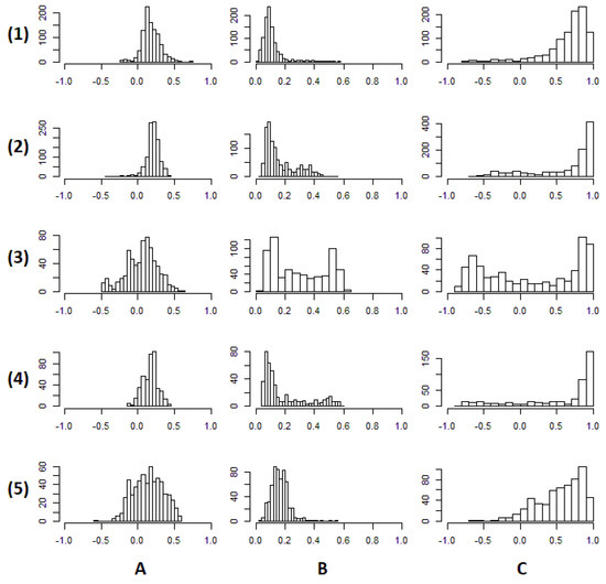 Distribution of the mean difference (A), standard deviation (B), and correlation coefficient (C) of the absolute deviation of the NDVI curve for 23 periods at different sampling points in 2010 for built-up, crop, forest, grass, and water from (1) to (5) (in each chart, the horizontal axis in the figure is the numerical definition domain of the corresponding indicators, and the vertical axis is the cumulative number).
