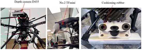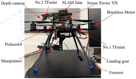 In this system, the quad-rotor UAV utilizes an F450 carbon fiber frame with a wheelbase length of 450 mm. It is equipped with 920 kV brushless motors and Hobbywing 20A ESCs and is fitted with 10-inch nylon propellers. The flight control system is the Pixhawk 4, an open-source flight controller based on the Nuttx operating system and developed by the Pixhawk team (http://docs.px4.io/main/en/flight_controller/pixhawk4.html, accessed on 5 March 2023). Pixhawk 4 has an integrated 3-axis 16-bit accelerometer/3-axis gyroscope ICM-20689. Furthermore, the UAV is equipped with the NVIDIA Jetson Xavier NX processor (https://www.nvidia.cn/autonomous-machines/embedded-systems/jetson-xavier-nx/, accessed on 8 March 2023), possessing powerful artificial intelligence computing capabilities. It also incorporates the Slamtec RPLIDAR S2, an omnidirectional LiDAR, for SLAM map construction and autonomous navigation (https://www.slamtec.com/cn/S2?wt.mc_id=Slbd_qg_ld_100142pc&sdclkid=AL2G15o615F_152R&bd_vid=6769858087028764337, accessed on 10 April 2023). The installation of a LiDAR on the UAV should meet the following requirements: horizontal angle between 0° and +2° (tilted upwards); opening angle of ≥+270°, preferably in the front and rear of the UAV; angle of coverage of ≥+220°. The sensor should avoid a scanning blind spot of 15° and the laser sensor TFmini (https://www.benewake.com/TFminiS/index.html?proid=325, accessed on 12 April 2023) is installed on the manipulator of the UAV for altitude control. In Figure 1, the TFmini labeled “1” represents the laser sensor mounted on the manipulator.