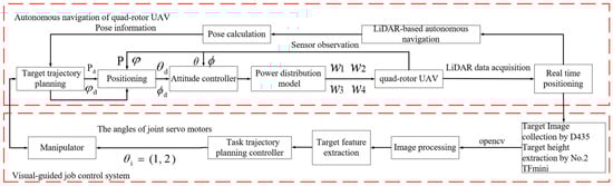 The control system proposed for the aerial manipulator adopts a hierarchical control approach comprising the autonomous navigation system for quad-rotor UAVs and the vision-guided manipulator operation control system. The autonomous navigation system for quad-rotor UAVs includes real-time positioning and attitude control via LiDAR. The vision-guided manipulator operation control system extracts target object feature information and controls the arm for grasping tasks. The entire control system for the aerial manipulator is shown in Figure 4.