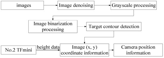 The visual guidance-based laser range measurement used in this paper is shown in Figure 6. First, the two-dimensional image information of the target object is captured with the D435 depth camera with a 120° wide field of view to facilitate rapid target object identification. Next, the edge detection algorithm is applied using OpenCV to extract the contour information of the target object’s edges. The NO. 2 TFmini sensor is employed to collect real-time height information for the UAV and target object to determine the height information of the UAV relative to the target object. Finally, by transforming the coordinates between the target object and the camera coordinate system, the position relationship between the UAV and the target object is established, facilitating the adjustment of the manipulator’s various joint servo angles to achieve precise grasping.