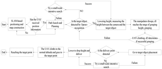 Step 5: The UAV proceeds toward the designated target delivery point for searching. If the search is successful, the UAV descends to the predetermined placement height to deliver the target object. If the search is unsuccessful, the UAV continues with a small-scale iterative search. By maintaining a constant UAV altitude and implementing a delayed hovering approach, a certain buffer time is provided to the manipulator control system to make angular adjustments, ensuring synchronization between the manipulator control system and the flight control system.