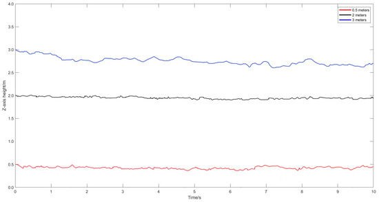 First, the flight stability during hovering was tested. Figure 12 provides height variation curves for the manipulator in the z-direction at hover heights of 0.5 m, 2 m, and 3 m. At a hover height of approximately 0.5 m, a slight fluctuation occurred in the UAV’s attitude due to ground effects. However, when flying at ~2 m, the flight was stable. Meanwhile, at a hover height of ~3 m, significant attitude variation occurred. Therefore, the selected hover height for this study was 2 m.