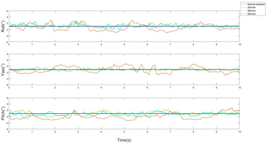 Second, to minimize the impact of manipulator motion on the stability of the flying platform, tests were conducted on the servo motor speeds. The testing scenario involved controlling the servo motor speed of the manipulator through the upper computer while the UAV was in stationary hover. Figure 13 provides the attitude angle variation curves of the servo motor at different speeds (35, 48, and 55 rpm). Moreover, the manipulator moved slowly at 48 rpm, and under conditions that ensured the operational efficiency of the manipulator, the impact of its motion on flight stability was minimized.