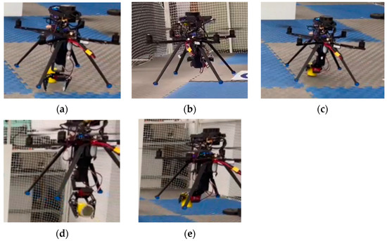As shown in Figure 14, for the grasping task of the aerial manipulator, a segmented grasping strategy was applied. Specifically, five poses were designed, including the initial pose, pre-grasping pose, grasping pose, flight pose in operation, and delivery pose. The specific process was as follows: