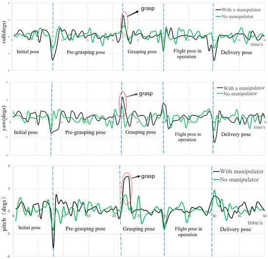 Between 22 s and 30 s, the aerial manipulator entered the state of grasping the target object. Compared to the state without the manipulator, the presence of the manipulator resulted in larger variations in the attitude angles due to the weight of the grasped object. In particular, the pitch angle experienced fluctuations, however, generally remained within ±5° for control. The mechanical gripper completed the grasping action before and after 22 s (as indicated by the red circle in Figure 15). Subsequently, the aerial manipulator ascended to the operational flight pose, reached the target location for delivery, and landed at the destination. Throughout the flight process, the variations in the attitude angles can be controlled within ±5°, which falls within the normal fluctuation range. This also demonstrates the good stability of the designed operational aerial manipulator system.