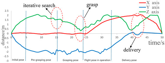 As shown in Figure 16, the aerial manipulator took off and entered the target search state at approximately 2 m. During the iterative search for the target object, the positional information along the x, y, and z axes of the aerial manipulator fluctuated. At approximately 22 s, when the target object grasping was completed, considerable fluctuation occurred in the positional information along the x, y, and z axes. The height information along the z-axis was 35 cm, while the physical height of the aerial manipulator was 30 cm. Hence, the grasping height was within an acceptable operational range, confirming that the proposed method exhibits good control effectiveness.