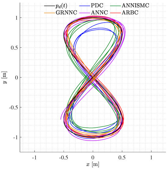 where is the desired trajectory in the three-dimensional cartesian space. The paths obtained through the experimental tests for the PDC, ANNISMC, GRNNC, ANNC, and ARBC schemes are depicted in a three dimensional fashion in Figure 4. Additionally, a top view of the same paths showing the drawn trajectories along with the desired trajectory in the plane is given in Figure 5.