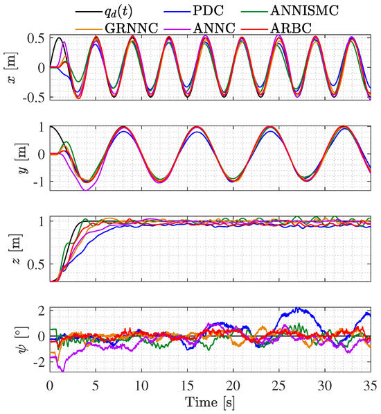 In Figure 7, the tracking errors obtained with the tested schemes are presented. It can be observed from it that the GRNN, ANNC, and ARBC have better performances than the PDC and ANNISMC in the x and y coordinates.